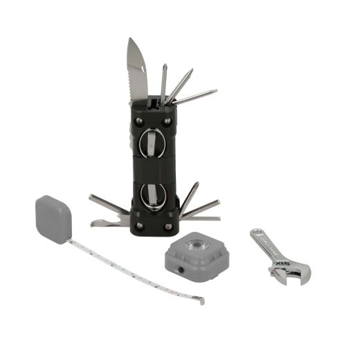 Multi herramienta 13 en 1; cuerpo de plástico con lámpara y flexómetro. Utiliza 3 baterías LR44 (no incluidas)