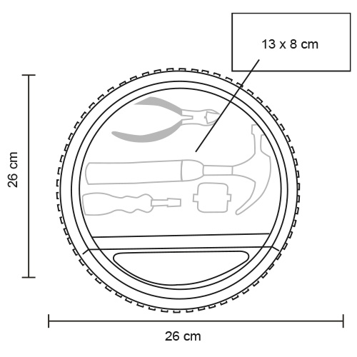 Set de herramientas en forma de llanta que incluye: 1 martillo; 1 pinza; 1 flexómetro; 1 destornillador y 2 juegos de 10 puntas.