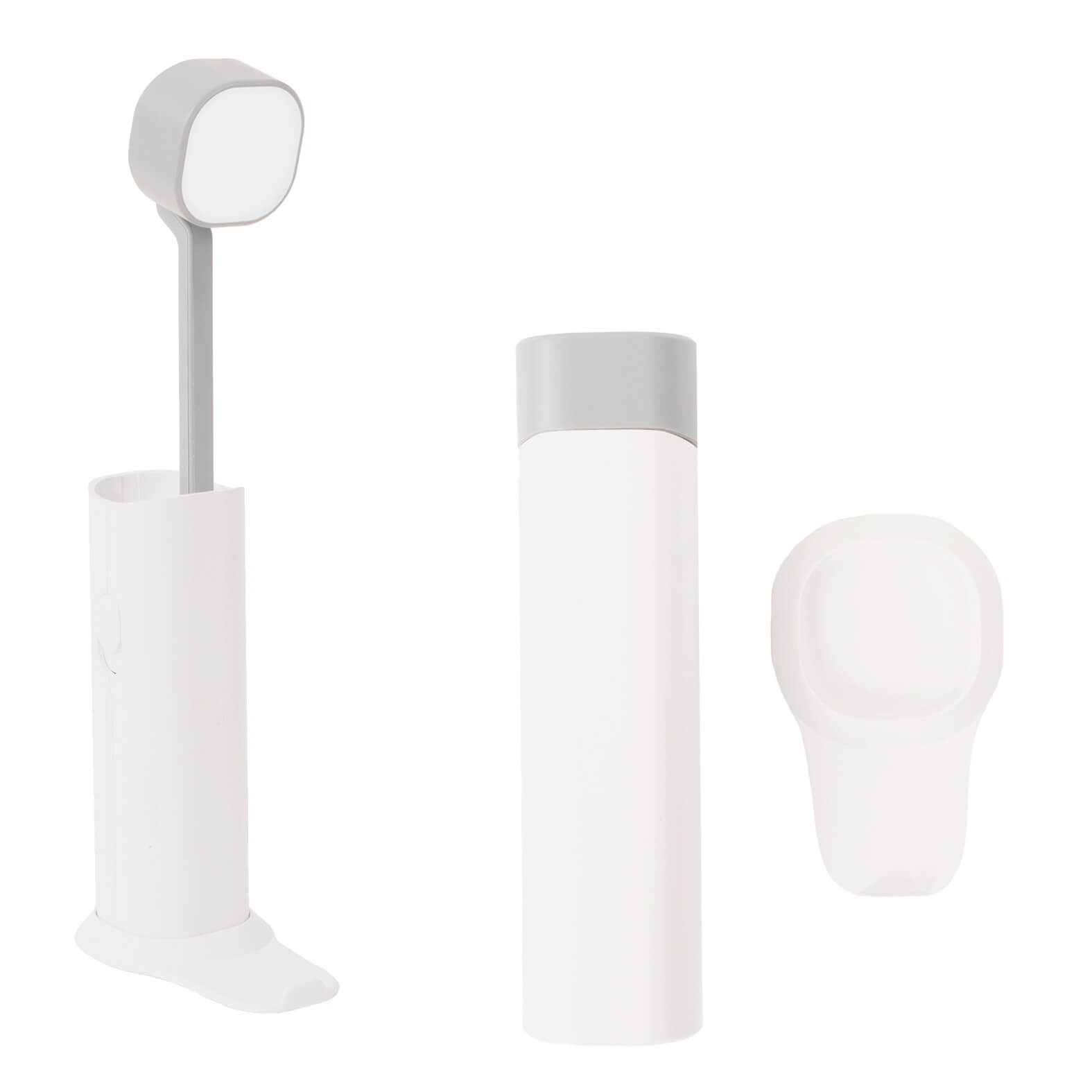 Lámpara recargable de luz LED con 3 niveles de intensidad; plegable; base para soporte de celular y power bank.