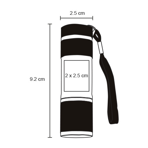 Lámpara metálica con 9 LEDS de luz blanca; con botón de encendido y apagado. Incluye correa de mano. Utiliza 3 baterías AAA ( no incluidas).