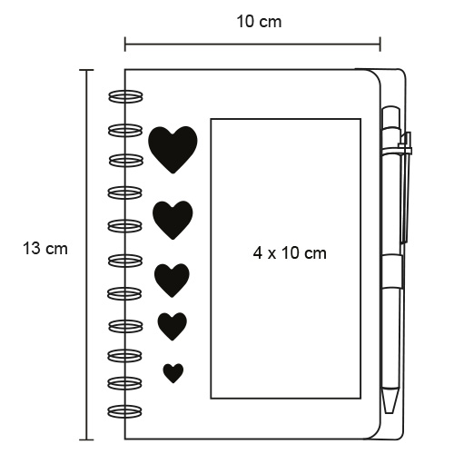 Libreta de cartón con figuras de corazón; espiral; 70 hojas rayadas y bolígrafo.