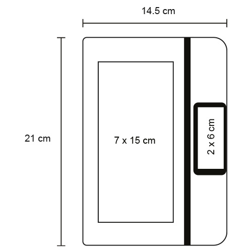Libreta reciclada de café con 82 hojas de raya; detalle de bambú que sirve cómo soporte para celular; separador y banda elástica.