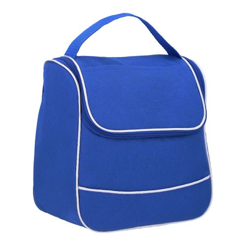 Lonchera de poliéster con interior impermeable plastificado; cierre; asa y un compartimento externo al frente.