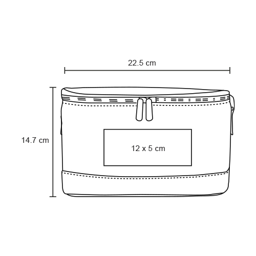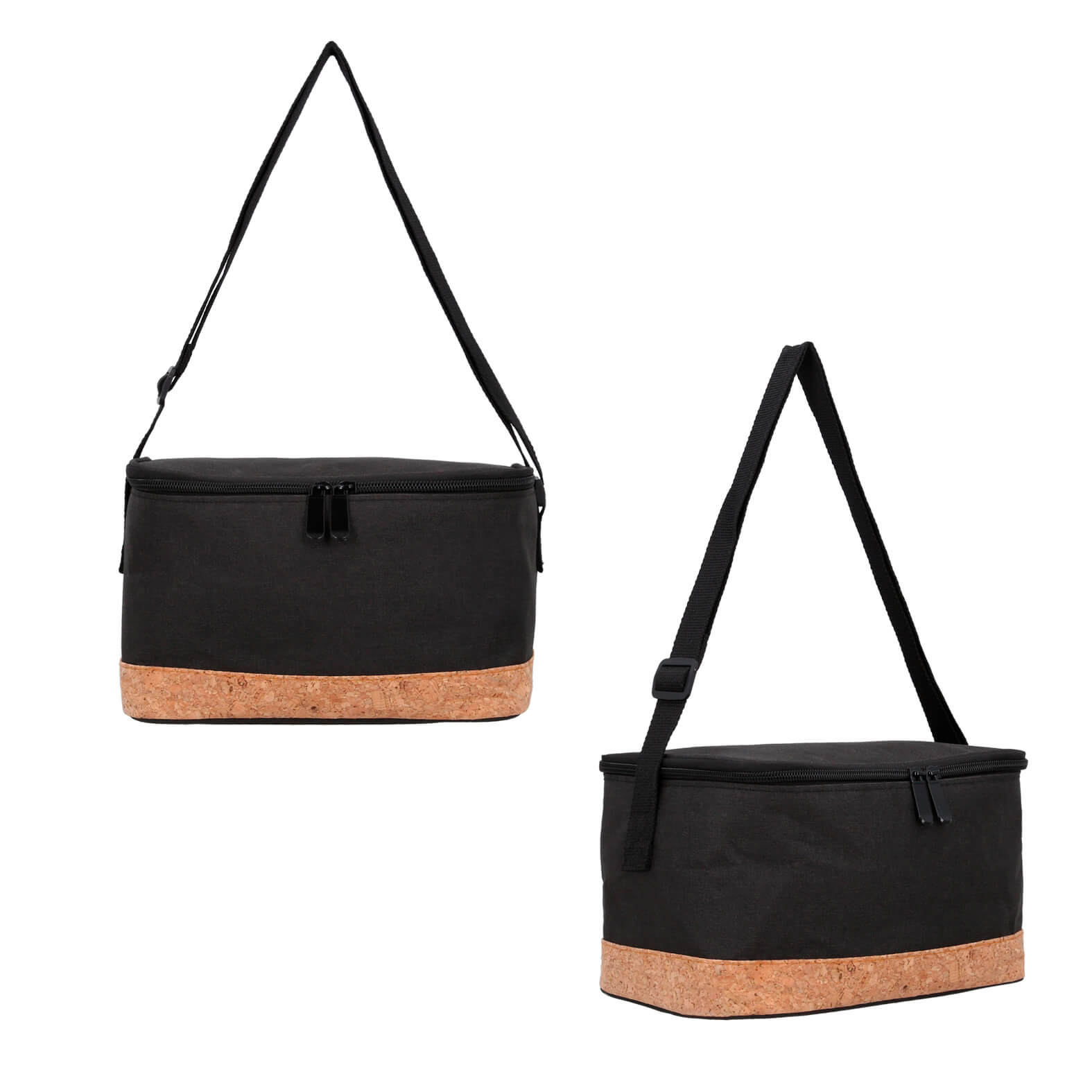 Lonchera de poliéster con interior metalizado; doble cierre; correa ajustable y detalle de corcho en la parte inferior.
