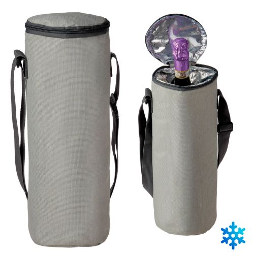 Portavino termico resistente con interior metalizado; cierre y correa ajustable.