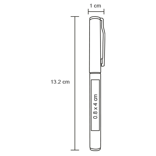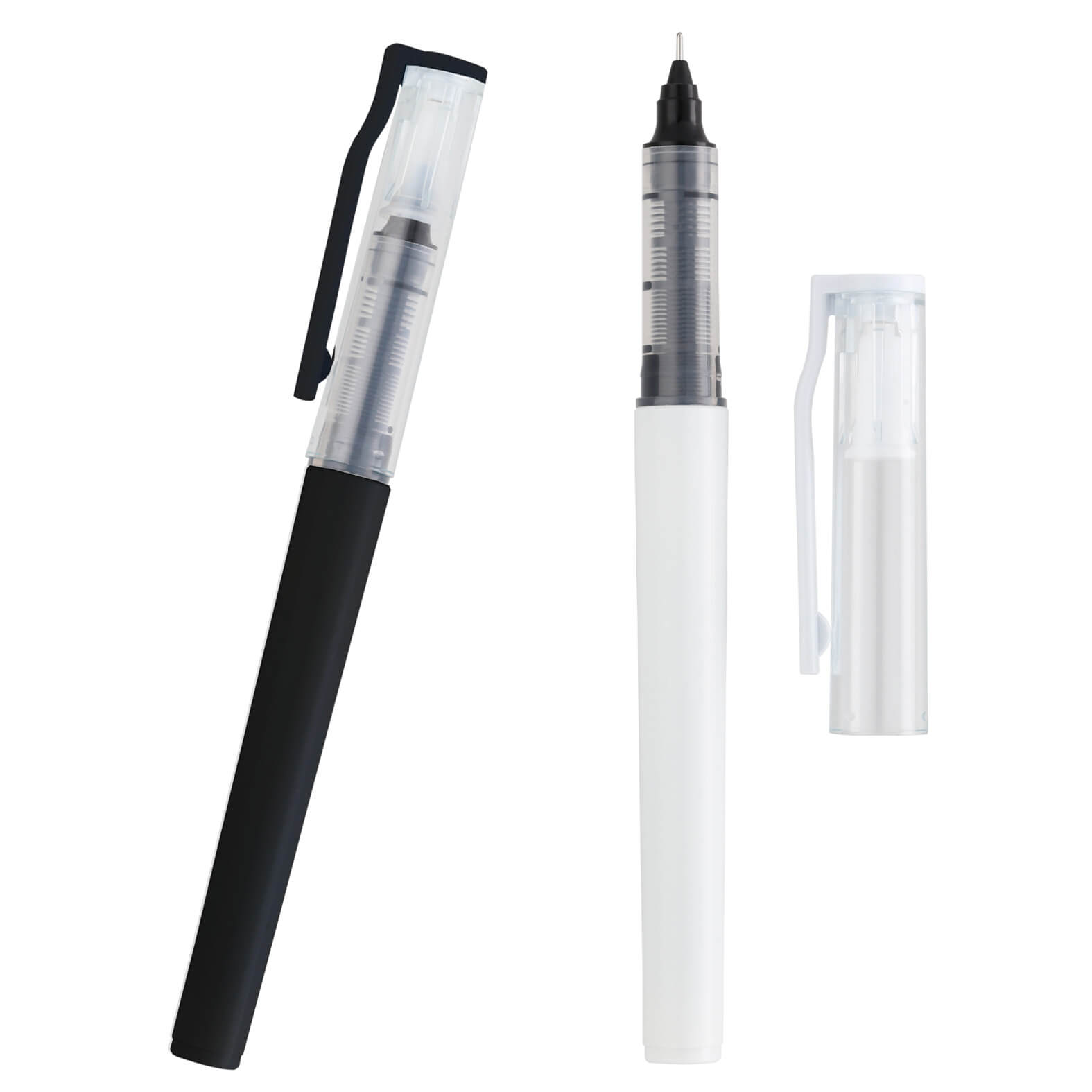 Bolígrafo de plástico con tinta negra de gel; tapa traslúcida y clip de plástico.