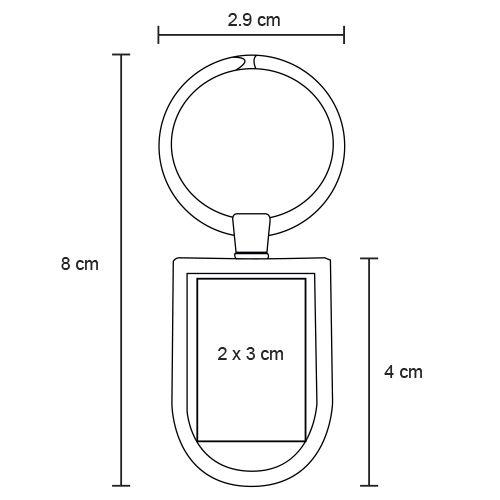 Llavero metálico rectangular con la parte inferior redondeada y aro reforzado.