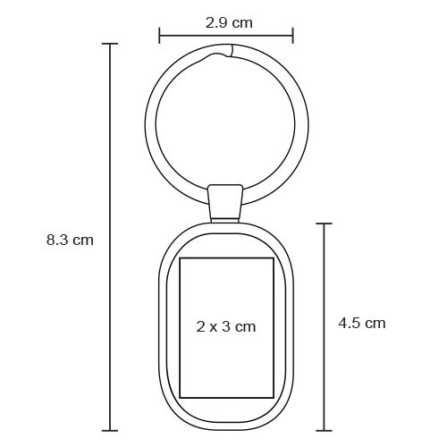 Llavero con placa metálica central; esquinas redondeadas y aro reforzado.