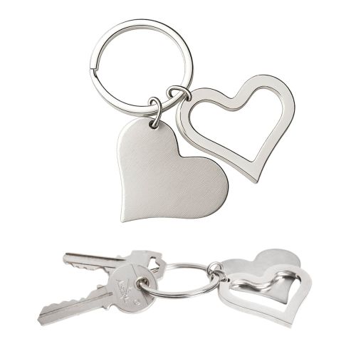 Llavero metálico doble en forma de corazón; placa sólida y silueta; con arillo reforzado para colgar.