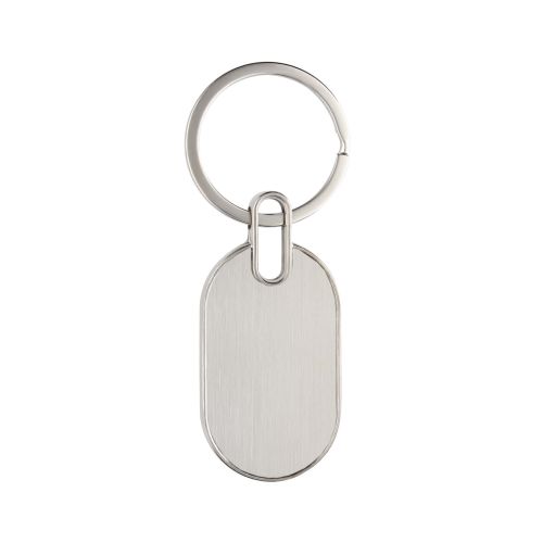 Llavero metálico de placa solida en forma de ovalo con arillo reforzado.