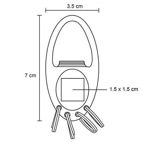 Llavero de metal en forma de ovalo con destapador y cuatro separadores.