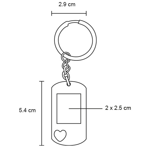 Llavero metálico rectangular con detalle de corazón en la parte inferior y aro reforzado. Incluye caja.