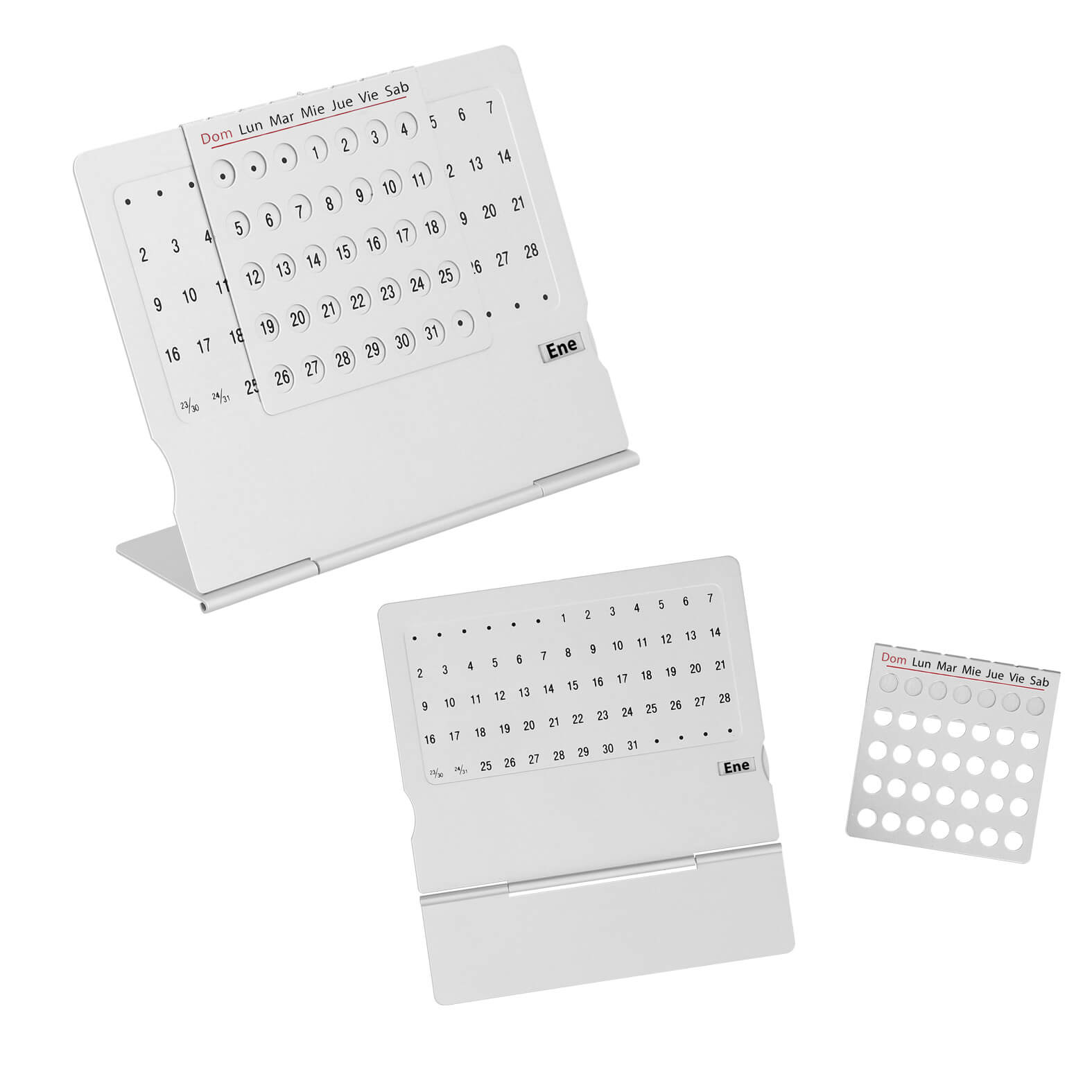 Mini calendario con base; rejilla movible y ruleta de aluminio para modificar los días y meses del año.