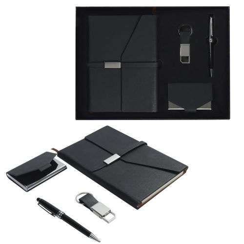 Set ejecutivo que incluye: 1 libreta tipo carpeta con cierre magnético; 1 llavero metálico con correa; 1 pluma de metal con mecanismo retráctil y un tarjetero.