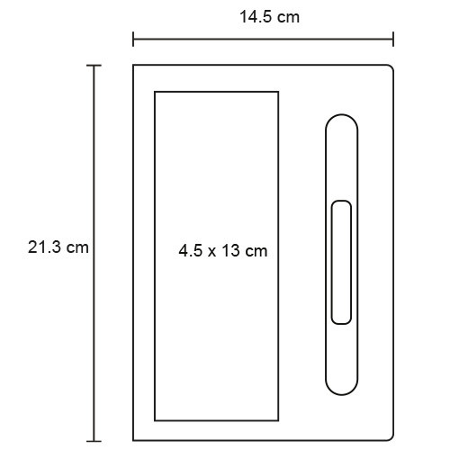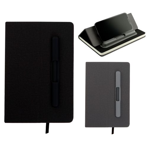 Libreta de poliuretano con 98 hojas rayadas; separador; bolígrafo y portada ajustable que sirve como soporte para celular.