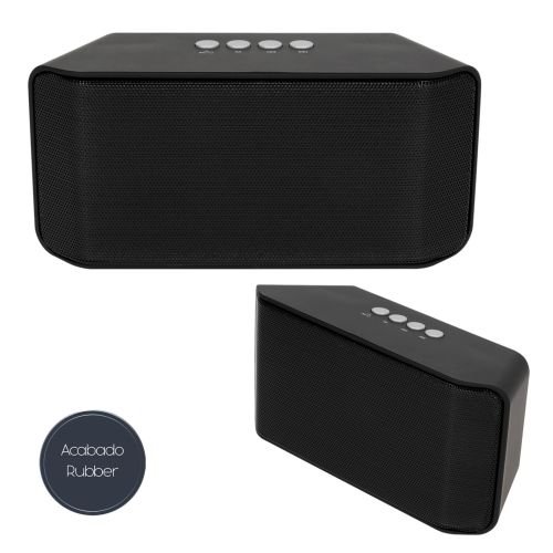 Bocina portátil bluetooth en acabado rubber; micro SD; USB; auxiliar y radio. Incluye cable de carga y auxiliar. Batería recargable con duración de 4 hrs.