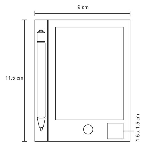 Mini pizarrón digital de plástico; con plumilla; botón para eliminar escritura; botón de bloqueo para evitar la pérdida de información e imán en la parte trasera. Incluye una batería.