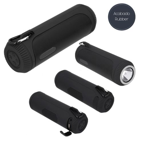 Bocina portátil bluetooth de plástico en acabado rubber con placa metálica; radio FM; botón de encendido y apagado; control de volumen; función de manos libres; lámpara de luz LED; asa; arnés de metal; cable aux.; cable para carga micro USB; entrada tarje