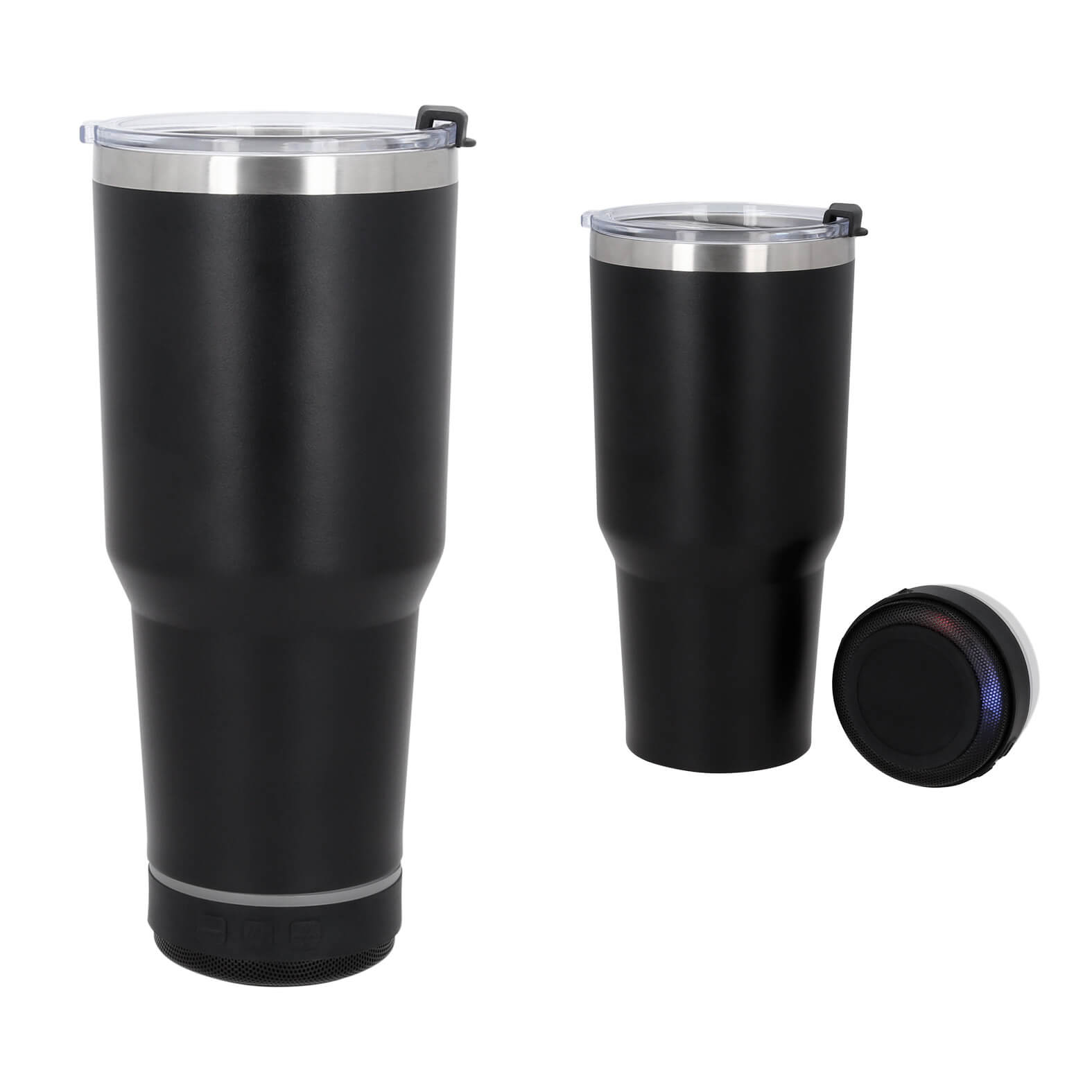 Termo con doble pared de acero inoxidable; insulado al vacío que cuenta con bocina bluetooth con controles de volumen; botón de reproducción; efectos de luz y micrófono para contestador de llamadas. Incluye cable tipo C. (La bocina es removible de la base