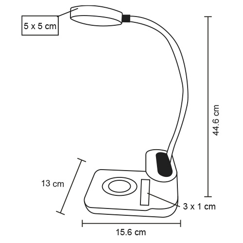 Lámpara de escritorio con sensor touch de tres niveles; organizador; reloj digital; cargador inalámbrico; puerto USB y Tipo C. Incluye cable de carga Tipo C.