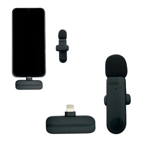 Micrófono inalámbrico con pinza y conexión lightning; botón de encendido/apagado; carga Tipo C y conexión Bluetooth. (Incluye adaptador tipo C)