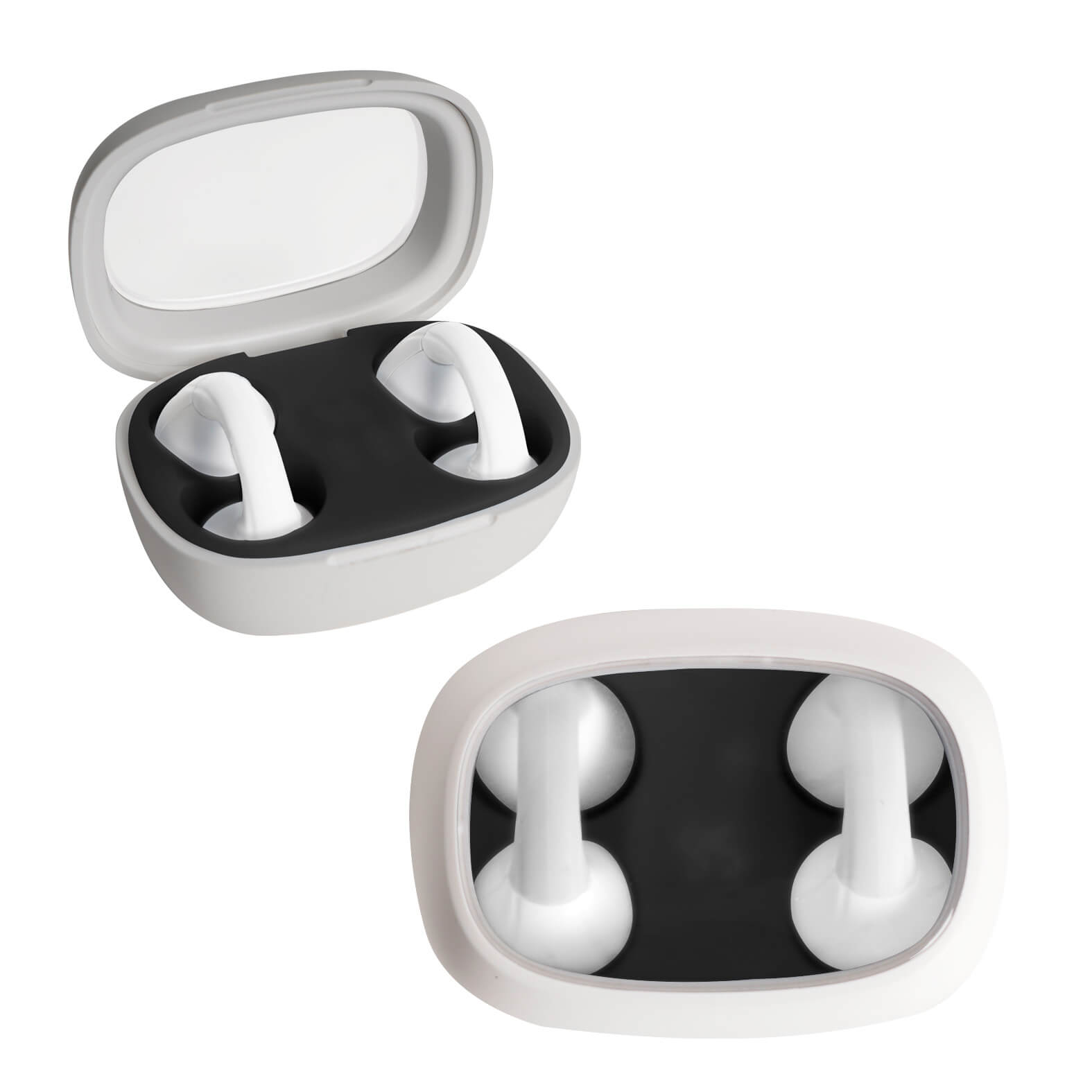 Audífonos inalámbricos con botones táctiles para pausar/reproducir; adelantar y retroceder. Incluye un estuche recargable con indicador de carga y entrada tipo C.