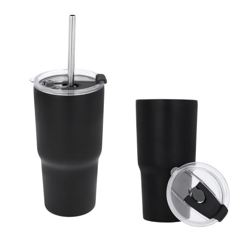 Termo con doble pared de acero inoxidable con tapa traslúcida y cierre a presión; boquilla de seguridad de plástico; boquilla de silicón cubre popote y popote metálico incluido.