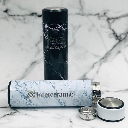 Termo con doble pared de acero inoxidable con acabado tipo mármol. Incluye colador.
