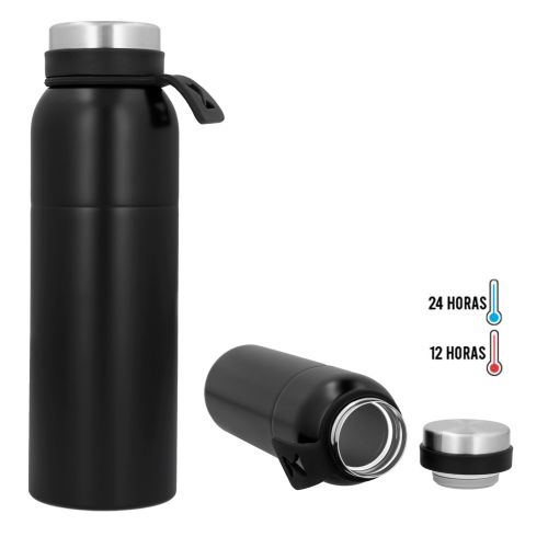 Termo con doble pared de acero inoxidable; tapa metálica enroscable; base y asa de silicón.