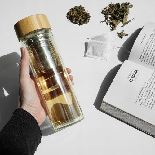 Termo con doble pared de vidrio e infusor; colador de metal y tapa de bambú enroscable.