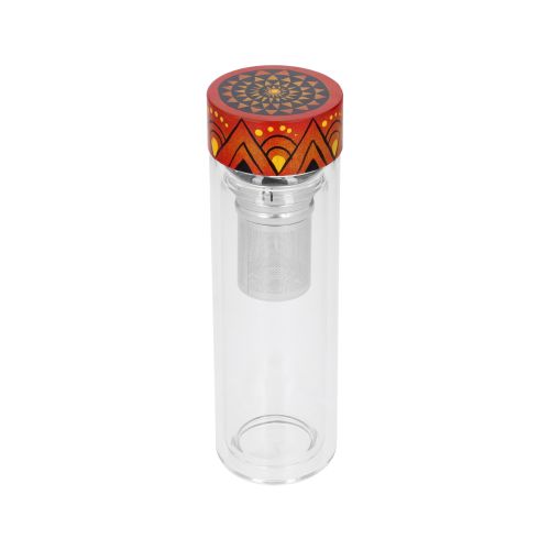 Termo con doble pared de vidrio; infusor de metal y tapa enroscable de bambú. EDICIÓN ALEBRIJE.