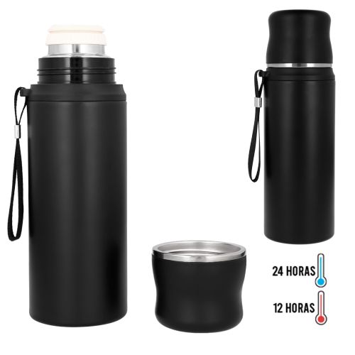 Termo con doble pared de acero inoxidable insulado al vacío. Incluye tapa de rosca que se utiliza como taza y una cinta ajustable para sujetarlo.
