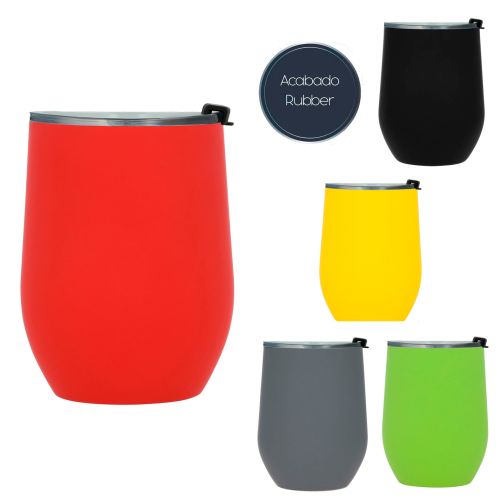 Termo con doble pared de acero inoxidable y acabado rubber. Incluye tapa transparente de cierre a presión.