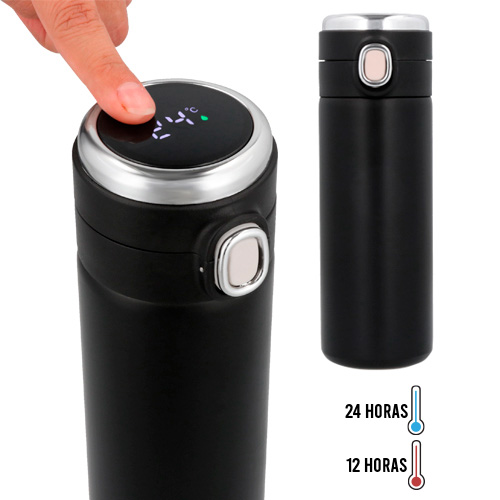 Termo de acero inoxidable y doble pared insulado al vacío; cuenta con tapa de seguridad y termómetro digital que mide la temperatura de tu bebida.