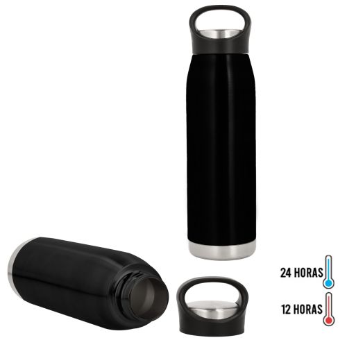 Termo de acero inoxidable con doble pared insulado al vacío con agarradera en la tapa.
