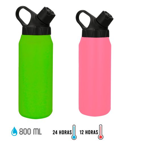 Termo insulado al vacío con doble pared de acero inoxidable y acabado rugoso. Incluye tapa enroscable con boquilla y asa en la parte superior.