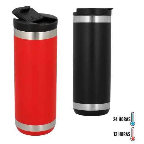 Termo de acero inoxidable de doble pared insulado al vacío con acabado rugoso tapa enroscable con cierre de seguridad.