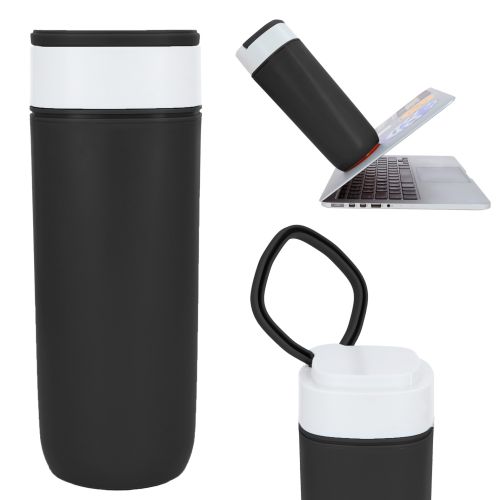 Termo de doble pared con exterior de plástico e interior de acero inoxidable. Incluye tapa enroscable con asa.