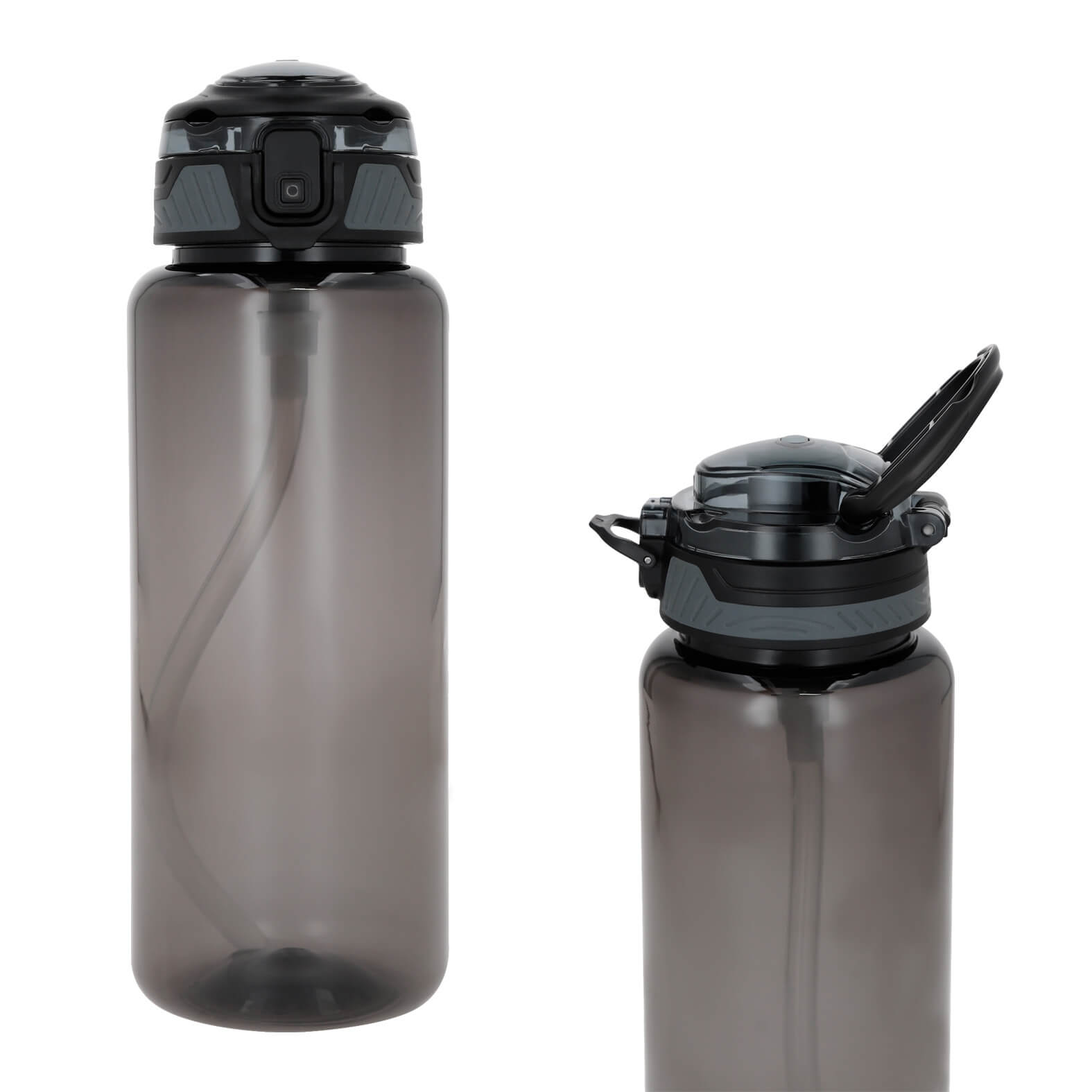 Cilindro de plástico con tapa enroscable; broche de seguridad; popote retractil y asa. (El stock de la base se maneja por separado). Medidas del empaque de la base: 32 piezas por caja.