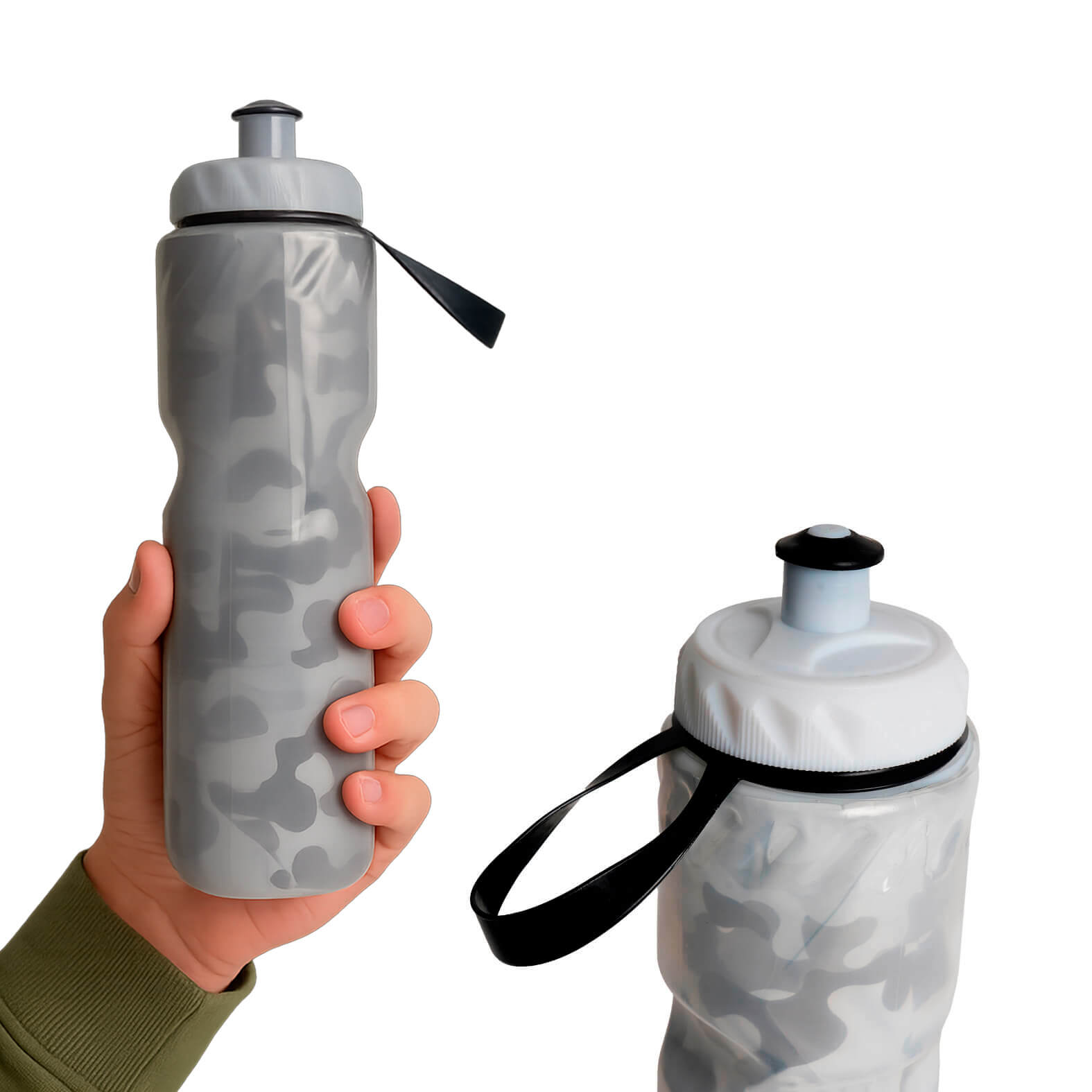 Cilindro de plástico con diseño militar; asa y tapa enroscable con chupon.