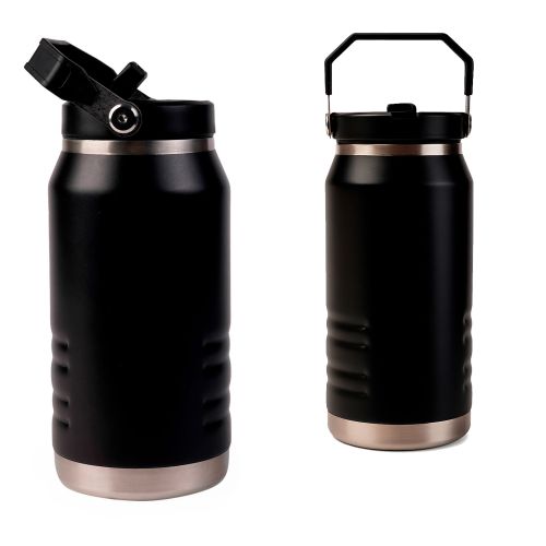 Termo con doble pared de acero inoxidable; insulado al vacío; con acabado rugoso y tapa enroscable que cuenta con boquilla abatible; popote y asa en la parte superior.