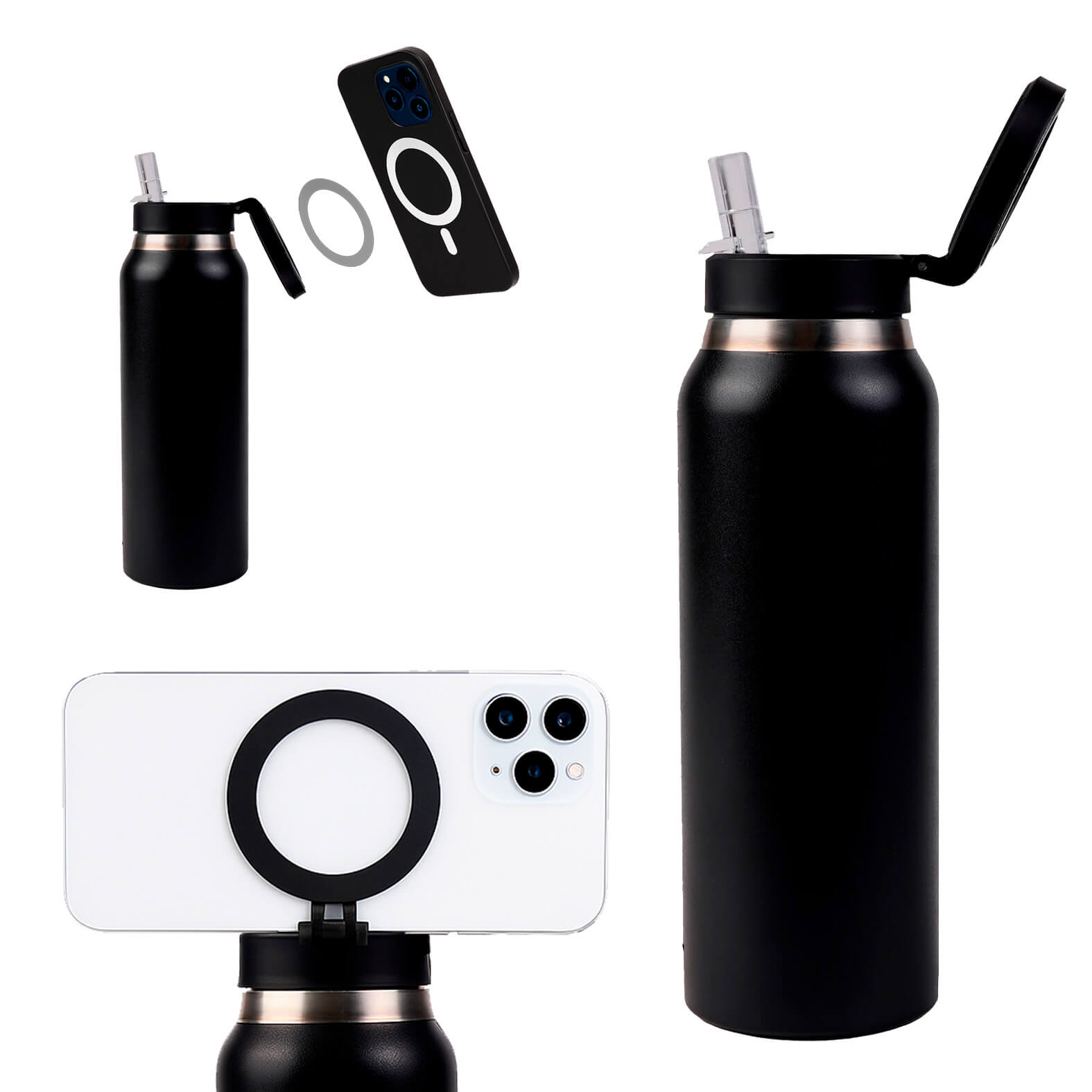 Termo con doble pared de acero inoxidable; insulado al vacio con acabado plastic painting. Cuenta con tapa enroscable con boquilla abatible; popote y asa con soporte magnetico para celular. Incluye aro metalico.