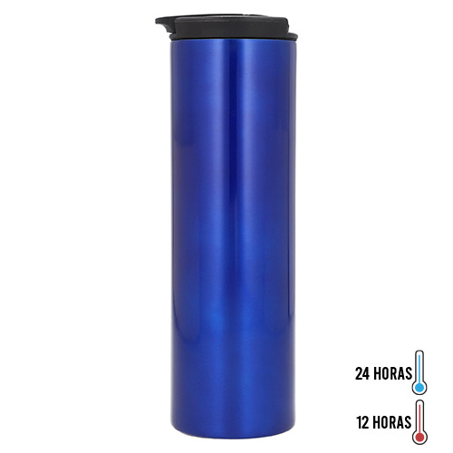 Termo con doble pared de acero inoxidable; tapa hermética enroscable y botón para evitar derrames.