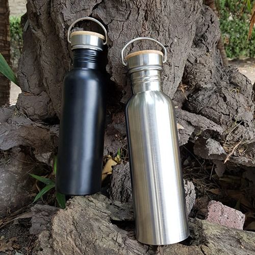 Cilindro de acero inoxidable con detalle de bambú en tapa.