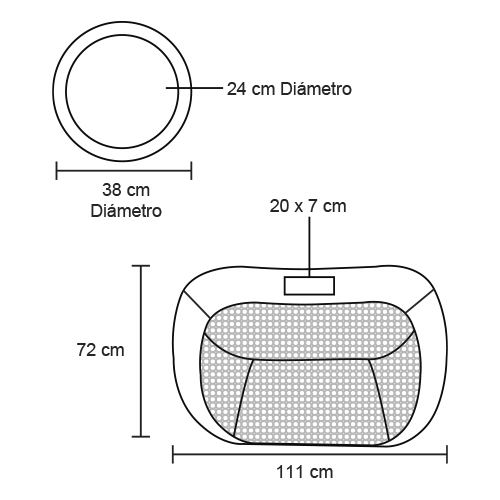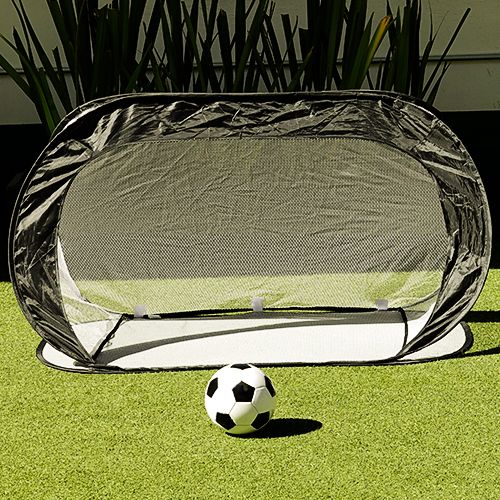 Portería plegable de poliéster con broches de velcro; 4 asas y 4 estacas de metal para fijarla al suelo. Incluye funda.