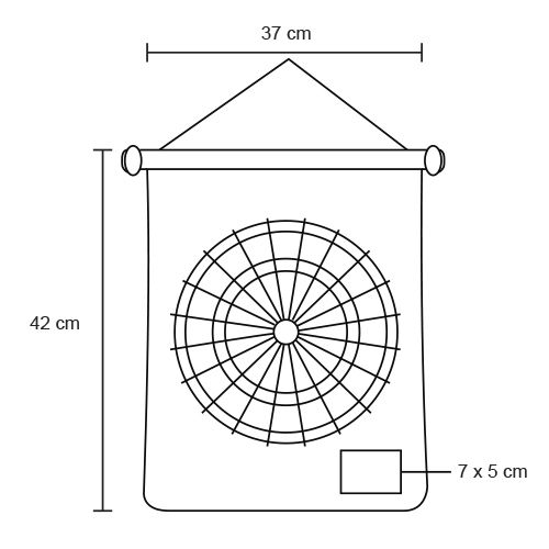 Juego de dardos magnéticos con telón de poliéster enrollable y asa para colgar. Incluye 4 dardos; tablero magnético con diversos blancos y estuche cilíndrico de cartón.