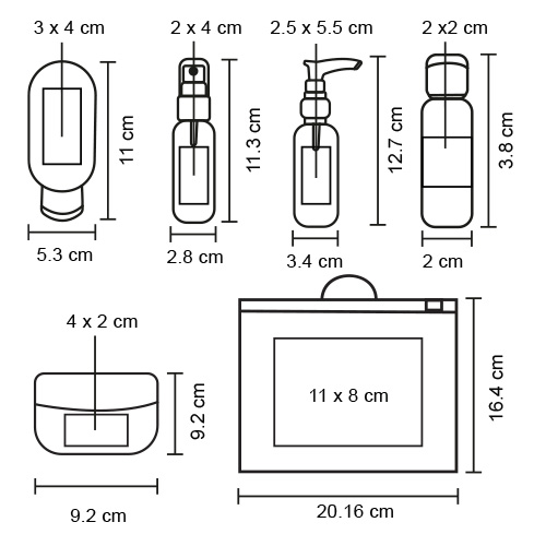Set de viaje con 8 accesorios: 1 atomizador; 1 bote con dispensador; 2 botes con tapa Disc Top; 1 bote; 1 recipiente para almacenamiento; 1 mini embudo y 1 palita. Incluye estuche.