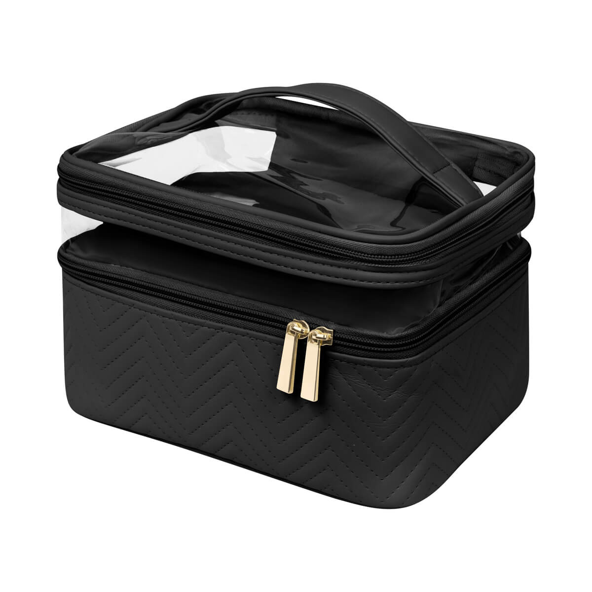 Neceser fabricado en PU con cuerpo semirrígido. Cuenta con dos niveles con cierre, ideales para organizar y separar productos de belleza o higiene personal. Su panel superior de mica transparente permite visualizar el contenido fácilmente, mientras que el
