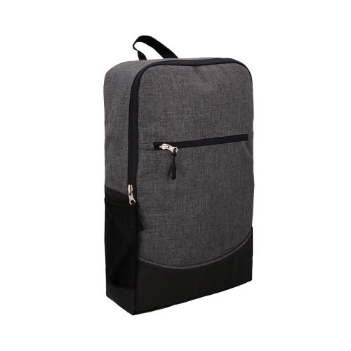 Mochila con compartimento principal acolchonado; base reforzada con curpiel; pequeño compartimento frontal; dos mallas laterales; dos correas ajustables; asa superior y fuelle.
