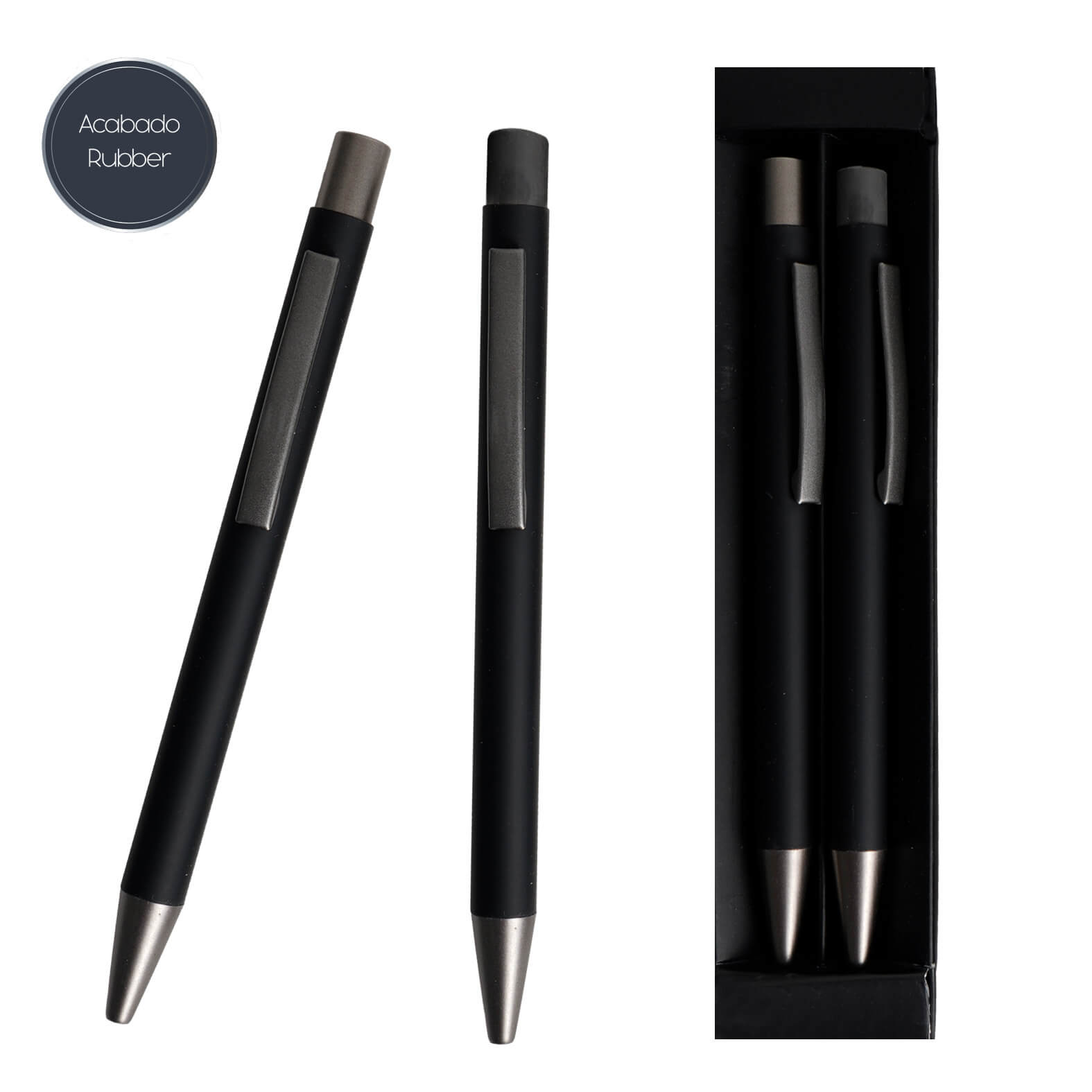 Bolígrafo y lapicero metálicos con acabado rubber; clip y mecanismo de click. Incluye estuche